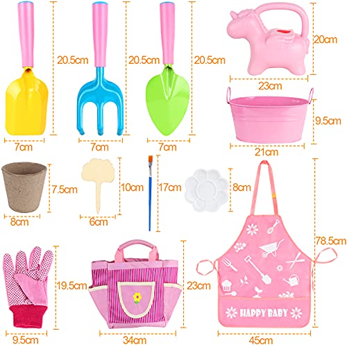 [19 Set di attrezzi da giardino per bambini] 1 annaffiatoio a forma di unicorno, 1 pala, 1 rastrello, 1 mestolo, 1 borsa per attrezzi da giardino, 1 guanto da giardino, 1 grembiule da giardino, 3 targhette per piante di alta qualità, 4 vasi di torba, 1 vaso per fiori in metallo rosa, 8 pigmenti colorati, 2 pennelli, 1 palette di miscelazione con foro per impugnatura.