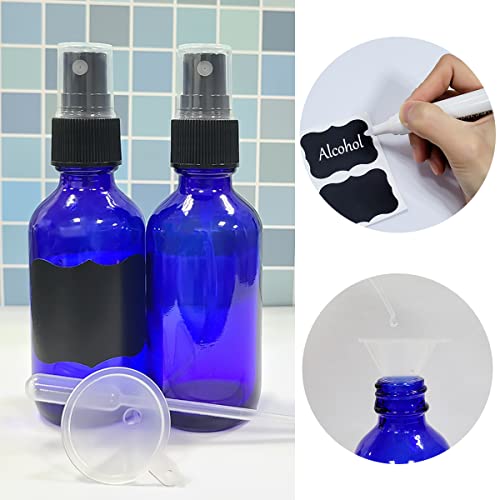 【La confezione contiene】 Include 2 flaconi spray in vetro blu da 60 ml, 4 nebulizzatori neri, 4 adesivi etichetta nera, 1 imbuto, 1 contagocce.