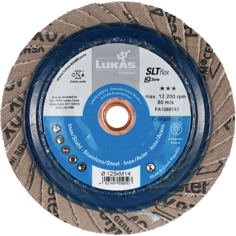 Le lamelle a forma di falcetto (brevettate) sono collegate in modo radiale a un nocciolo ad alta resistenza in GFRP. La struttura senza platorello permette di ottenere un'elevatissima sporgenza delle lamelle. Elevato spessore del rivestimento. Attacco filettato M14, non è necessario nessun dado di serraggio. Grana ceramica (CER) con legante superiore abrasivo per impieghi gravosi. Uso: Per la lavorazione di punti di difficile accesso, levigatura di contorni e molatura di saldature d'angolo. La lunga sporgenza delle lamelle permette un taglio morbido. Dati tecnici CuZn m/s limitatamente adatto INOX m/s idoneo Ti m/s idoneo Acciaio < 55 HRC m/s idoneo Acciaio < 60 HRC m/s idoneo Al/Mg m/s limitatamente adatto Acciaio < 900 N/mm² m/s idoneo GG(G) m/s limitatamente adatto Acciaio < 1400 N/mm² m/s idoneo a secco idoneo Acciaio < 67 HRC m/s idoneo Velocità periferica massima m/s 80 Sigla materiale abrasivo Ceramica Percentuale di ferro, zolfo e cloro %