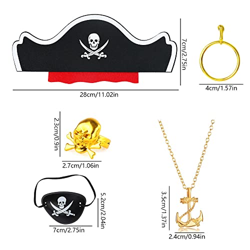 Gli accessori del costume da pirata di Halloween includono 1 pezzo di berretto con teschio da pirata, 1 pezzo di benda sull'occhio da pirata, 1 pezzo di anello con teschio, 1 pezzo di orecchino a cerchio d'oro e 1 pezzo di collana a catena con ciondolo ancora d'oro, 5 pezzi in totale.