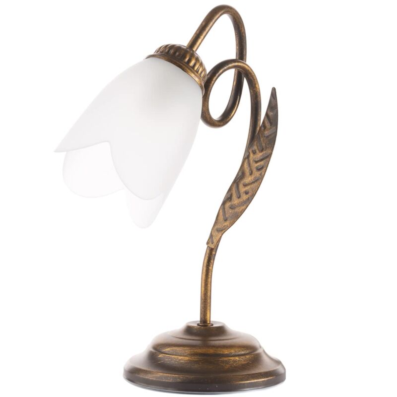 Collezione in stile classico disponibile in colore avorio e bronzo. La sua struttura in ferro battuto presenta una forma sinuosa a giro che dona un tocco di stile al prodotto. Il paralumi sono in vetro bianco satinato e la forma ricorda un fiore. Ideale per la cucina e la camera, si adatta ad ambienti classici, shabby chic, rustici ma anche moderni. Lampada da tavolo color avorio spennellato oro a 1 luce con attacco E14. La struttura in ferro presenta una decorazione di foglia che rende il prodotto elegante e classico. Il lumetto è largo 23 cm e alto 33 cm.