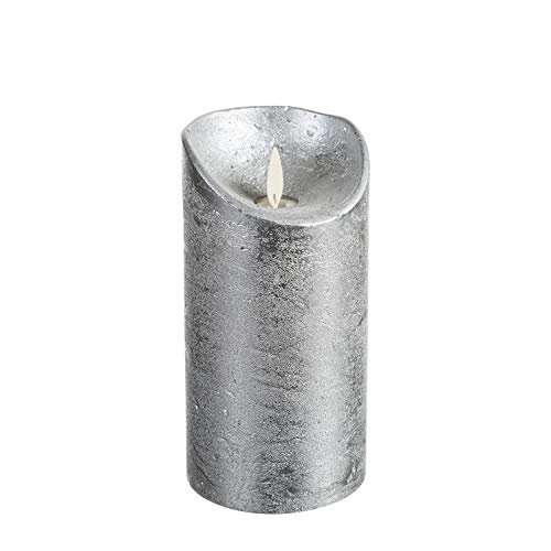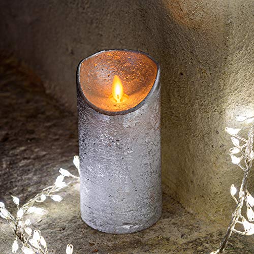 LuminalPark Candela cilindrica Cera Ruvida Argento, Ø 7,5 cm, h 15 cm, LED Bianco Caldo, Fiamma in Movimento, Timer, Telecomando Opzionale, Batteria, Interno