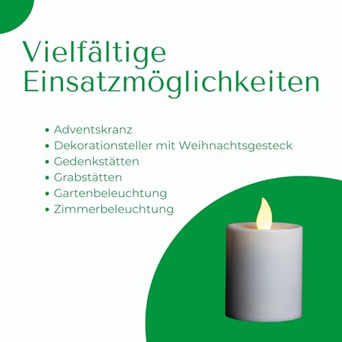 Nessuna fuliggine, nessuna macchia di cera, nessun cambio di candela, utilizzabile in caso di vento e intemperie, convincente grazie all'effetto tremolante realistico, è ideale come illuminazione per tomba.