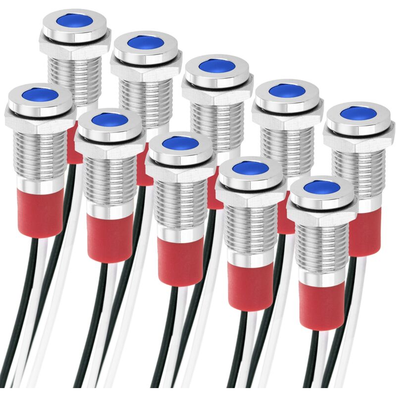 Lampada spia con tecnologia LED. È un dispositivo di illuminazione di piccole dimensioni che viene spesso utilizzato come indicatore luminoso in diverse apparecchiature e sistemi. Il prodotto è adattabile a molteplici utilizzi a seconda delle esigenze dell'utilizzatore. La sua struttura e flessibilità lo rendono ideale per l'installazione in qualsiasi luogo, anche se di difficile accesso. Caratteristiche del prodotto: CARATTERISTICHE: Indicatore luminoso di alta qualità. Questo prodotto ha un'elevata luminosità. Ha un corpo metallico e un cavo da 200 mm che offre completa libertà di posizionare il pilota dove serve. Il cavo ha anche due poli lunghi 15 cm. Il prodotto ha una struttura a pannello incassato che ne facilita l'utilizzo e l'installazione. La tensione è di 12 VDC e il consumo è di 0,072 W. Il colore della luce LED è blu. La confezione contiene 10 unità. COMPATIBILITÀ: compatibile con punte da 8 mm di diametro. Il pilota da 8 mm è compatibile con un'ampia varietà di