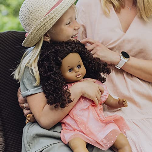 Bambola parlante morbida Selma è una delle bambole più belle da 45 cm di Lundby. Questa bambola alla moda è vestita con un abito da bambola rosa color corallo. Mescola e abbina abiti da bambola da 18 pollici con i suoi amici di bambola della stessa dimensione. Questa bambola ha lunghi capelli ricci neri castano scuro brillante che puoi spazzolare. I suoi occhi si chiudono quando si sdraia.