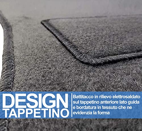 Composizione del prodotto in moquette nera di alta qulità inodore, con logo ricamato e battitacco sul tappetino anteriore lato guida