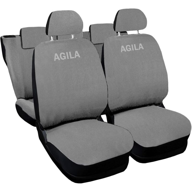 Coprisedili auto compatibili per Agila, con schienale posteriore diviso per la versione 40e60 e seduta intera. Fodere anteriori compatibili con airbag laterale Come sono fatti: Realizzati in tessuto misto cotone e poliestere con tessuto elasticizzato nella parte posteriore della fodera. Logo Ricamato. Lavorazione prodotto interamente italiana Dove lo posso montare: Le fodere sono compatibili per Agila Cosa ricevo a casa: Un set Completo composto da 12 pezzi | 4 Coprisedili anteriori (lato guida 2pz + lato passeggero 2pz), 3 Coprisedili posteriori (Schienale 2pz + seduta), 5 Copri Poggiatesta. Set Ganci incluso A cosa serve: Utile per non macchiare e/o danneggiare i sedili della tua auto e per personalizzare gli interni della tua auto migliorandone l'aspetto. Si prega di evitare di usare violenza durante il montaggio, in quanto gli elastici potrebbero strapparsi se la tensione è troppo alta