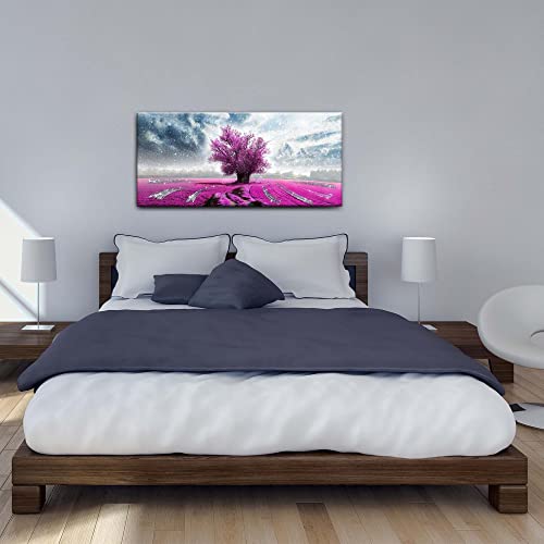 Lupia Quadro moderno su tela con Brillantini e Glitter argento, Albero solitario Fiori Viola e cielo stellato, per soggiorno, capezzale camera da letto 52X122 cm
