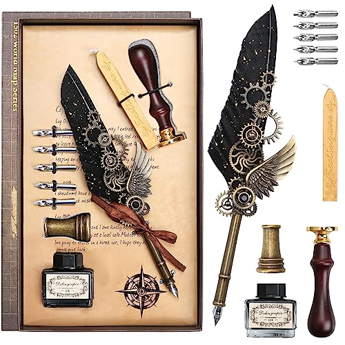 SET DI PENNA CALLIGRAFICA CON PENNA CON PIUMA PERFETTO: Questo set comprende una lussuosa Penna Stilografica con Penna Piuma con 5 diverse punte, ceralacca, un sigillo e una bottiglia da 15 ml di inchiostro. Ideale per i principianti nel mondo della calligrafia.