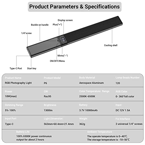 【Luci Fotografia】:La luce di riempimento LUXCEO P6 può richiamare 36.000 colori tramite APP e la temperatura del colore può essere regolata tra 2500K (luce calda) e 6500K (luce fredda). Impostazione della luminosità continua (5%-100%), luminosità massima: 1300 lm, indice di resa cromatica della sorgente luminosa di alta qualità (CRI≥95), che consente di mostrare meglio il colore delle cose quando si scattano foto senza sfarfallio.