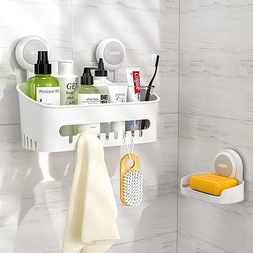 Luxear Mensola Doccia Ventosa + Portasapone, Set di Mensole Organizer per Bagno Senza Foratura Rimovibili, Cestino per Doccia da Bagno Porta Sapone per Shampoo Balsamo Sapone Bagno Cucina, Bianco