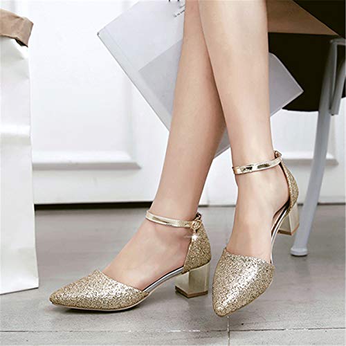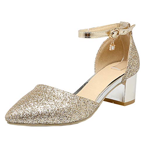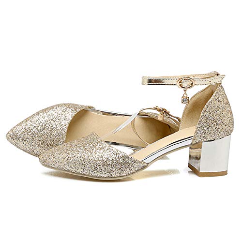 LUXMAX Scarpe Donna Glitter Decolte con Tacco a Blocco Medio Cinturino Fibbia Punta Chiusa (Oro) - 41 EU