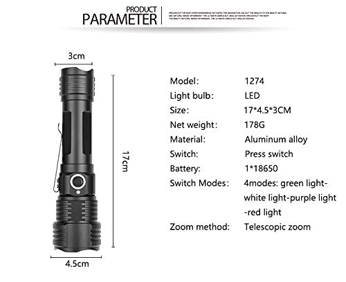 ▶ 【Torcia multicolore 4 in 1】 La torcia a led è super luminosa con luce bianca, luce UV, luce verde e luce rossa. Per soddisfare le tue esigenze in diversi ambienti, come la ricerca, la pesca, la corsa, la caccia, l'escursionismo, ecc.