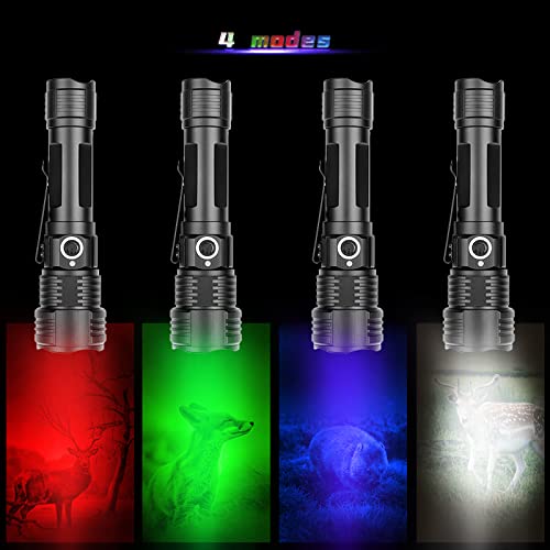 LUXNOVAQ Torcia LED ricaricabile multicolore 4 IN 1, torcia portatile tattica a LED con luce verde, UV, rossa e bianca, lampada torcia impermeabile zoomabile per caccia, escursionismo, campeggio