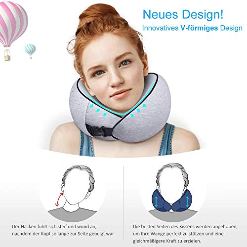 Design innovativo a forma di V per una tenuta perfetta. I due lati del cuscino sono sollevati per sostenere perfettamente le guance e ottenere una forza più uniforme. Il design ergonomico del foro posteriore si adatta perfettamente alla curva del cranio e sostiene il collo. Avvolgete delicatamente il collo e sostenete la testa e rendete il vostro viaggio più piacevole.