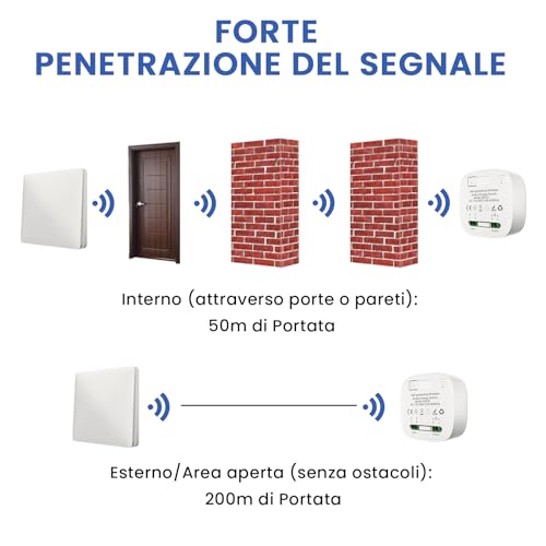 【Portata 50m】 L'interruttore luce senza fili consente un range di controllo fino a 50 metri al chiuso, il segnale forte può penetrare muri, porte e finestre, consentendoti di controllare le luci del corridoio dalla tua camera da letto. In aree esterne senza ostacoli, la distanza di controllo può arrivare fino a 200 metri.