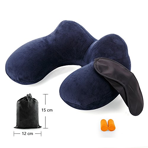 LUZWAY Cuscino da Viaggio Gonfiabile a 4 Supporti,Cuscino per Il Collo Ergonomico con Tappi per Le Orecchie e Maschera per Gli Occhi Ideale per Viaggiare in Aereo,Auto e Treno [Blu]