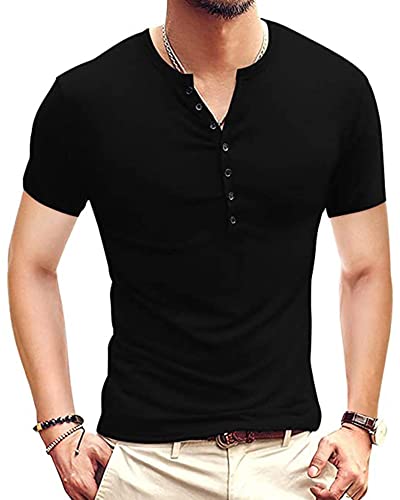 LVCBL Henley camicia da uomo Basic girocollo t-shirt con bottone a maniche lunghe abbigliamento casual, Nero, XXL