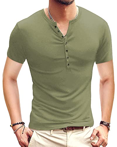 LVCBL Henley camicia da uomo Basic girocollo t-shirt con bottone a maniche lunghe abbigliamento casual, Verde militare, L