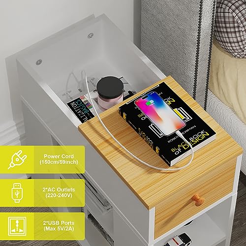 【Presa di Corrente e Connessioni USB】- Il comodino bianco è dotato di una presa multifunzionale. La presa di corrente ha 2 connessioni CA (max. 220-240V) e 2 connessioni USB (max. 5,1V/2,1A). Questa presa a tre cassetti può facilmente ricaricare dispositivi mobili come telefoni cellulari, tablet, lampade da tavolo, computer portatili, mini ventilatori, ecc.