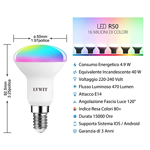 ☀ LVWIT Lampadina LED Riflettore Smart con Attacco E14, Forma R50, 4.9W equivalente a 40W di lampadina a incandescenza, 470Lm, pacco da 2 unità;