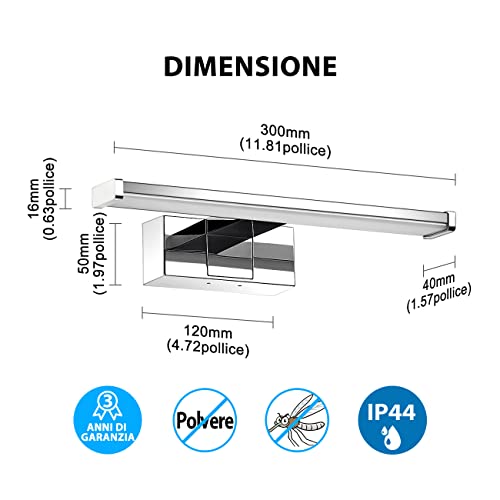 LVWIT Luce LED da Specchio per Il Bagno,Lunghezza 300mm,IP44 Impermeabile Resistente ad Acqua,Antiruggine,6W,480LM,Luce Bianca Naturale 4000K,Lampada LED Parete Lavabo,Pacco da Una Unità