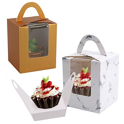 ✿ La Confezione Include: Le scatole per cupcake portatili hanno 24 pezzi in totale, con 2 stili diversi, scatole dorate e scatola per torta a strisce di marmo bianco. 12 ciascuno. Quantità sufficiente, in grado di soddisfare le tue esigenze quotidiane.