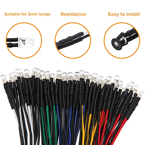 Lyeteung 50 Pezzi 3mm 12V Diodo ad Emissione Luminosa LED, Bianca Rosso Giallo Blu Verde, Luce a Diodi LED Precablata 20cm + 50 Pezzi 3mm Supporto in Plastica del Diodo