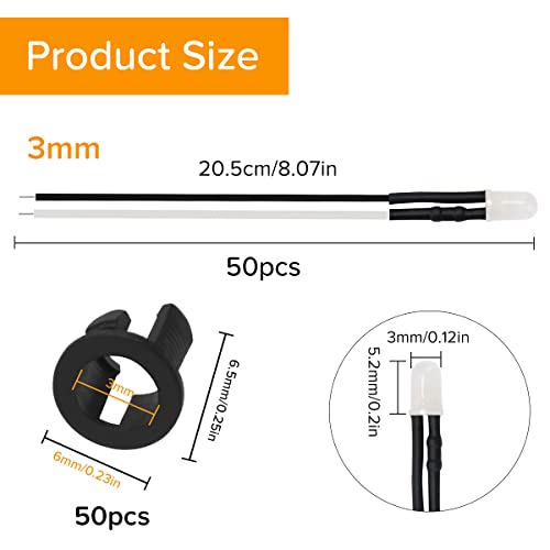 Lyeteung 50 Pezzi 3mm 12V Diodo ad Emissione Luminosa LED, Bianco, Luce a Diodi LED Precablata 20cm Colorate Diffuse + 50 Pezzi 3mm Supporto in Plastica del Diodo