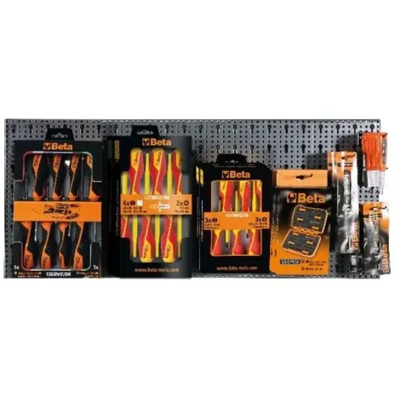 L'assortimento con ganci senza pannello 71 Pz. 066000380 Beta 6600 M/380 è un assortimento di prodotti Beta studiato per espositori e punti vendita.Questa selezione di prodotti è fornita con ganci ma senza pannello espositivo, acquistabile separatamente.La dotazione composta da 71 pezzi comprende nello specifico:- 2x Beta 1263MC/D8 Set da 8 cacciavite colorati varie misure- 2x Beta 1273MQ/F-D6 Set da 6 Cacciavite isolati 1000 V- 2x Beta 1273MQ/D6 Set da 6 Cacciavite isolati 1000 V- 2x Beta 1257LPH/S8 Set da 8 Microgiravite a lama piatta e croce Phillips- 5x Beta 1253 Giravite cercafase - 5x Beta 1253A Giravite cercafase doppio isolamento- 5x Beta 1254 Giravite provacircuito 6÷24V Tipologia: Espositori Prodotti correlati: Pareti espositive Beta Pezzi per confezione: 71 Dotazione: Set di cacciavite vari tipi con ganci, senza pannello Utilizzo: Espositori, Negozio Peso: 5,2 kg