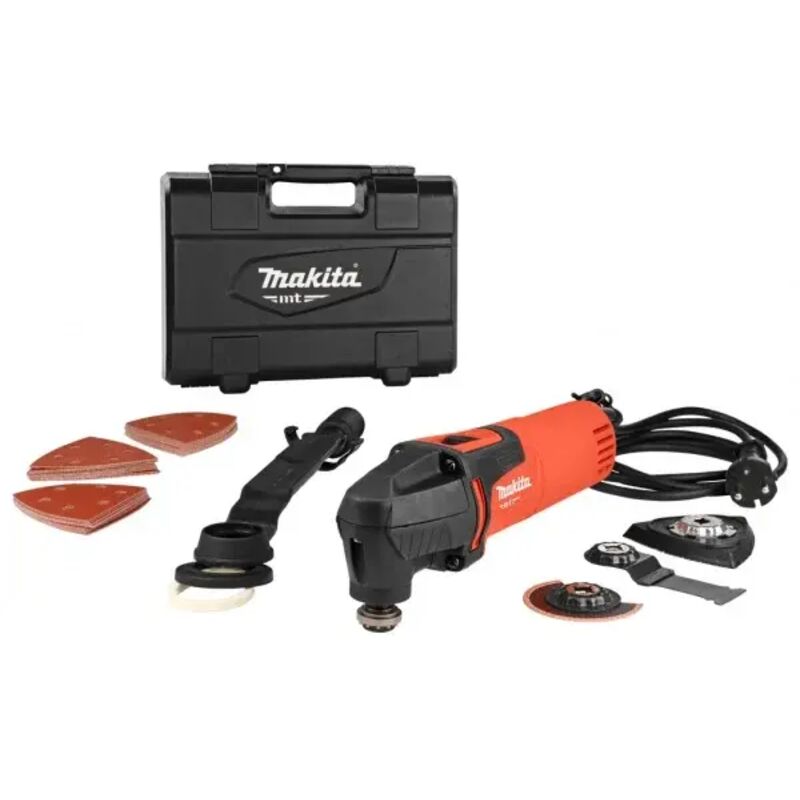 L'utensile multifunzione Makita M9800KX4 appartenente alla serie semi-professionale, grazie all'ampia gamma di accessori disponibili a catalogo si presta ad essere un valido supporto per moltissime operazioni.Grazie al movimento oscillante, abbinato al giusto accessorio, può essere adatto per operazioni di carteggiatura e taglio di su svariati materiali, per operazioni di finitura e manutenzione generica.Grazie al sistema di estrazioni delle polveri è ottimo per operazioni anche all'interno di abitazioni, come sostituzioni di piastrelle, taglio di battiscopa o asporazione di colla o moquette.Questo elettroutensile è realizzato con pratico variatore di velocità per addattarlo alle esigenze del momento.Praticissimo per operazioni anche in ambienti ristretti, offre possibilità di regolazione della lama su 12 differenti angolazioni.L'utensile multifunzione Makita è fornito con bocchetta di aspirazione, piastra di levigatura, carte abrasive gr 60-80-120, lama BIM per legno TMA047, lama per