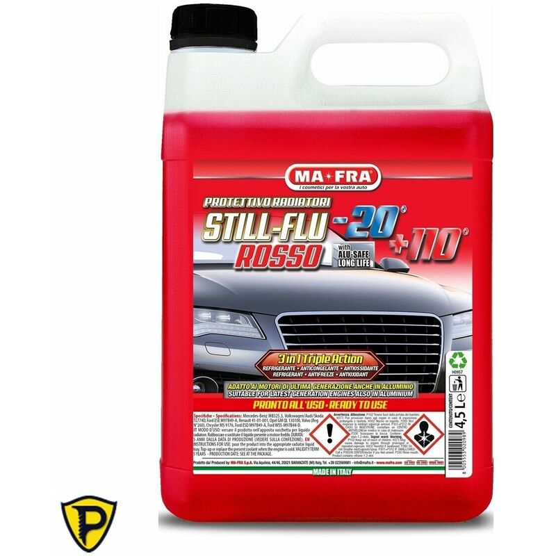 Liquido Radiatore Rosso MA-FRA Liquido per radiatori auto di tipo permanente, formulato con inibitori di natura organica. Il prodotto garantisce in modo particolare la protezione dei componenti in alluminio e in altre leghe leggere sempre più presenti nei motori di ultima generazione. Non crea incrostazioni né corrosione. Non evapora ed ha una forte azione refrigerante alle alte temperature, portando vantaggi in tecnici di affidabilità Specifico per: Mercedes-Benz MB325.3, Volkswagen/Audi/SkodaTL774D, Ford ESE M97B49-A, Renault 41-01-001, Opel GM QL 130100, Volvo (Reg. N°260), Chrysler MS 9176, Ford ESD M97B49-A, Ford WSS-M97B44-D ATTENZIONE: Per PURO si intende pronto all'uso, in caso diverso dovete scegliere CONCENTRATO SCEGLI IL COLORE CHE PIÙ SI AVVICINA A QUELLO UTILIZZATO DALLA CASA AUTOMOBILISTICA DELLA TUA AUTO. Modalità d'uso: inserire il prodotto tal quale nella vaschetta del liquido radiatore.