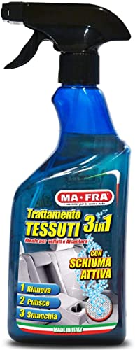 ✔️[TRATTAMENTO TESSUTI]: Il trattamento tessuti 3 in 1 Ma-fra e' il prodotto studiato per il lavaggio tappezzeria auto senza precedenti! Ideale per pulire la tappezzeria auto: sia sui tessuti che sulle parti in pelle. 3 in 1 Tessuti e' utile per smacchiare la tappezzeria autoe rigenerare sedili moquette tappetini fino al volante. In poche passate otterrete una pulizia interno auto sorprendente!