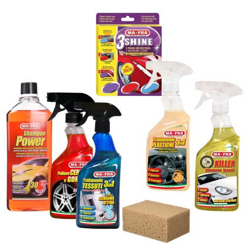 Set Ma-Fra trattamento tessuti e plastiche, pulitore cerchi, killer, shampoo power, 3 shine