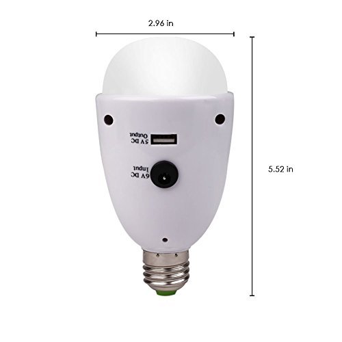 FUNZIONI CHIAVE: funzione emergenza in DC, in AC utilizzata come una normale lampadina, DC da 6V per il pannello solare, DC da 5V OUTPUT con ingresso USB.