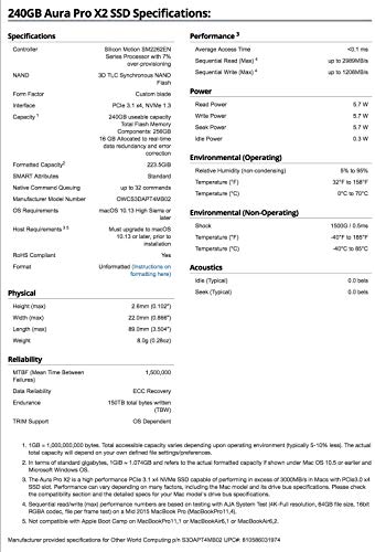 OWC SSD Aura PRO X2 da 240 GB per MacBook Air (metà 2013-2017) e MacBook PRO (Retina, fine 2013 - metà 2015) Computer (OWCS3DAPT4MB02)