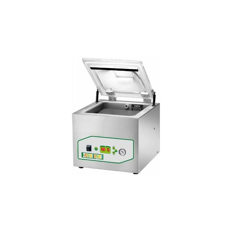 Codice RS7163 - Macchina confezionatrice sottovuoto modello FI-SCC/250, dimensioni cm. 32x50x27 (lxpxh), dimensioni utili in camera cm. 26x33x11, 230 volt, barra saldante da 25 cm, 0.35 kw, pompa vuoto 4 mc/h. Le macchine per sottovuoto a campana consentono di confezionare i cibi (sia solidi che liquidi) in modo pratico e permettono di prolungare i tempi di conservazione degli alimenti, mantenendo intatte le caratteristiche organolettiche. Struttura in acciaio inox, vasca stampata in acciaio inox, barra saldante estraibile, coperchio in plexiglass trasparente, pompa a bagno d'olio, pannello comandi digitale con 6 programmi memorizzabili. Possibile predisposizione per gas inerti.