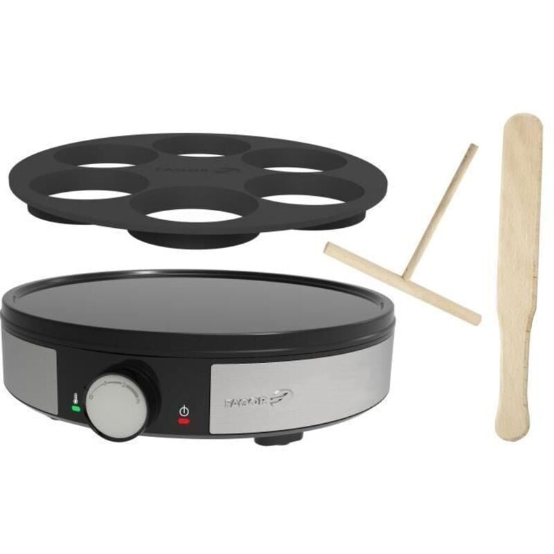 Approfitta di questa macchina per crepes perfettamente attrezzata con piedini antiscivolo, usa questa macchina per crepes in sicurezza! produttore di crepes Potenza: 1200 W Diametro piatto: 30 cm Termostato regolabile: 90 - 220°C Indicatore luminoso che mostra quando il dispositivo è acceso e quando il dispositivo è pronto per l'uso Manopola per il controllo della temperatura Piedini antiscivolo Accessori: Distributore di pastella a forma di T e una spatola in legno, inserto in silicone per 5 mini pancake La piastra fissa in alluminio Rivestimento antiaderente per una facile cottura e una rapida pulizia