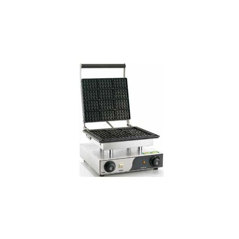 Codice RS9458 - Piastra waffel modello FI-WM15, 230 volt, 1500 watt, dimensioni cm. 34x37x24/58 (lxpxh). Struttura in acciaio inox, piastra di cottura teflonata dim. cm. 27.5x24.5, termostato 0-300°C, timer 0-5 minuti.