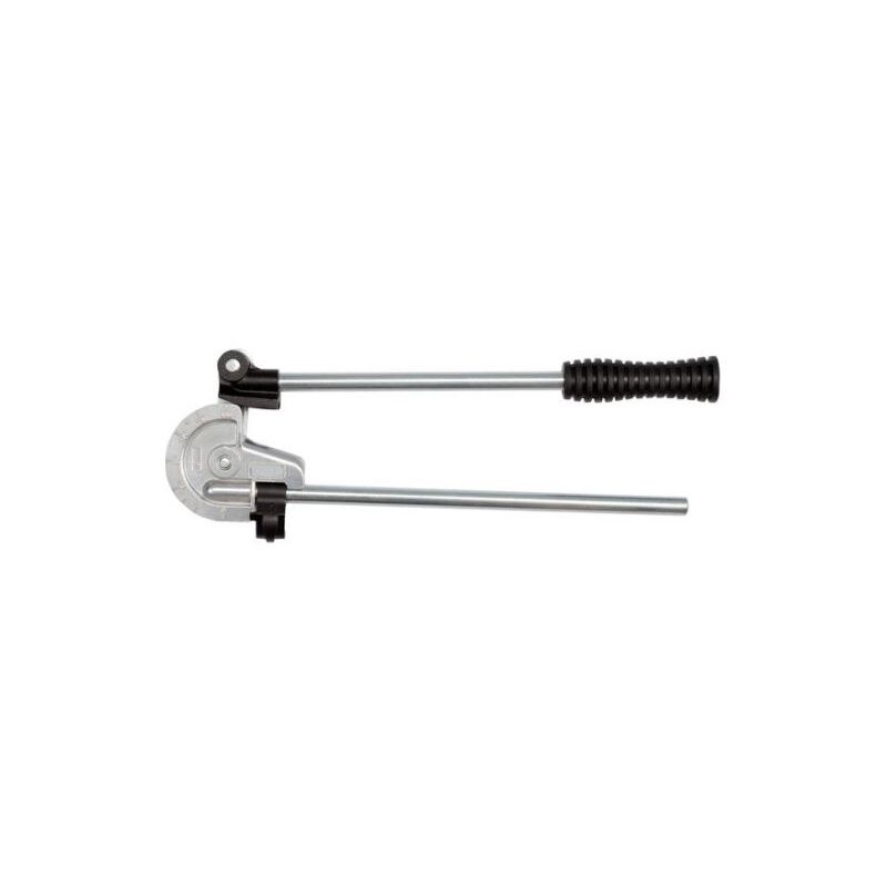 Macchina curvatubi per tubi diametro 18 mm. Ciò consente di piegare i tubi con un angolo di 180° senza schiacciarli. Gli angoli sono stampati sul corpo per determinare il grado di flessione. Il bloccaggio migliora il fissaggio del tubo e permette di piegare anche tratti brevi. Permette la curvatura di tubi in: rame ricotto, alluminio, acciaio dolce. Vantaggi del prodotto: - Corpo in alluminio consente di piegare tubi senza schiacciamenti - Goniometro in rilievo che determina con precisione il grado di piegatura - Bracci in acciaio resistenti - Blocco di fissaggio consente di piegare brevi tratti - Maniglia comoda Destinazione d'uso / Applicazione: Piegatura tubi in: rame, alluminio, acciaio dolce