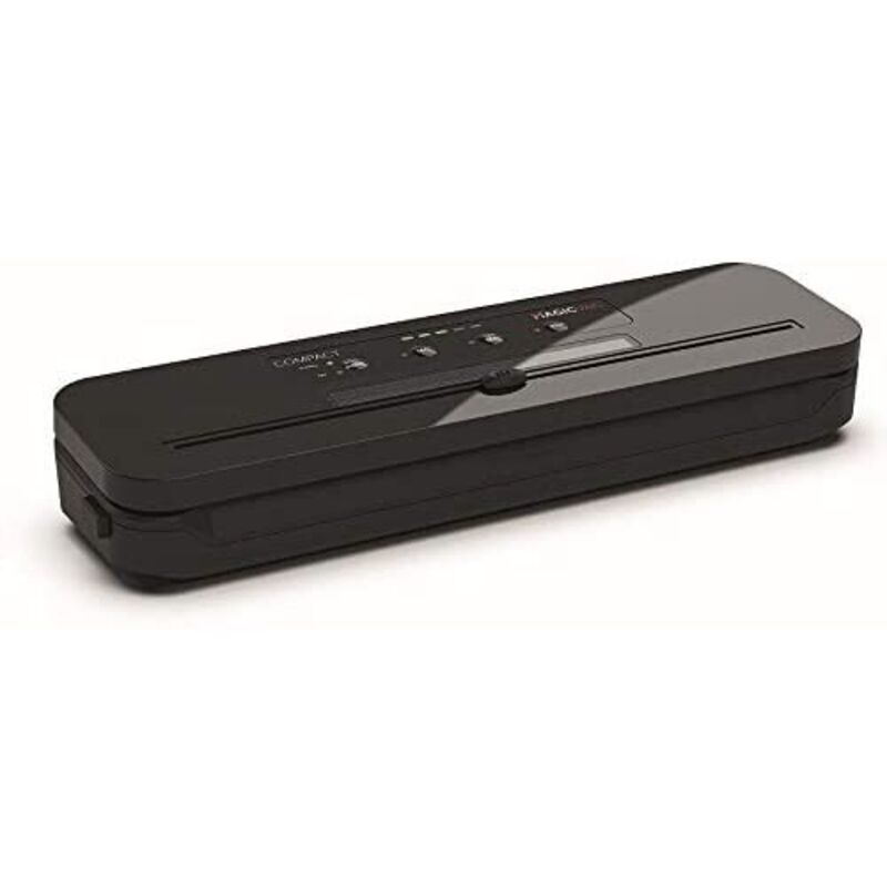 Magic Vac Compact. Colore del prodotto: Nero, Livello massimo di vuoto: 750 mbar, Funzioni della macchina sottovuoto: Contenitore, Solo sigillatura, Sigillatura sottovuoto. Potenza: 110 W, Tensione di ingresso AC: 220 - 240 V, Frequenza di ingresso AC: 50/60 Hz. Larghezza: 380 mm, Profondità: 100 mm, Altezza: 60 mm. Tipo di imballo: Scatola DESCRIZIONE Macchina sottovuoto potente e ultracompatta con taglia-sacchetti bidirezionale integrato. Comodo oblò per un corretto posizionamento del sacchetto. Doppia impostazione di sigillatura. Ciclo completamente automatico.Saldatura manuale per cibi fragili e delicati. Ciclo per la creazione del vuoto nei contenitori. Display avanzamento a 5 led. Camera del vuoto con vaschetta ferma-liquidi. Cavo alimentazione asportabile. Potenza: 110 W. Colore: nero. SCHEDA TECNICA CARATTERISTICHE TipologiaMachina Sottovuoto ModelloVK02PK1 Colore del prodottoNero Livello massimo di vuoto750 mbar Funzioni della macchina sottovuotoContenitore, Solo sigillatura