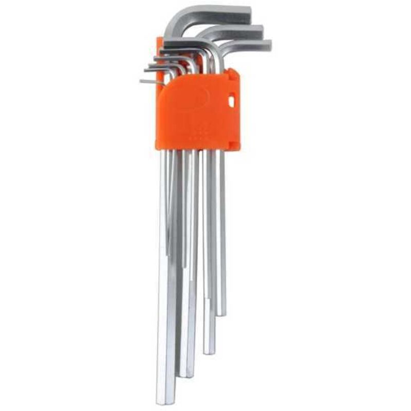 Serie 9 chiavi esagonali piegate lunghe Acciaio Cromo Vanadio - Supporto plastica Composizione: 1,5-2-2,5-3-4-5-6-8-10 Tipologia - Chiavi brugola-torx Marca - Alte Caratteristiche - mm 1,5/10 Sr Pz 9