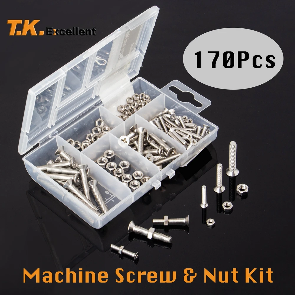 Machine Screws and Hex Nut 304 Stainless Steel M3 M4 M5 Bolt and Nut Assortment Kit,170 Pcs