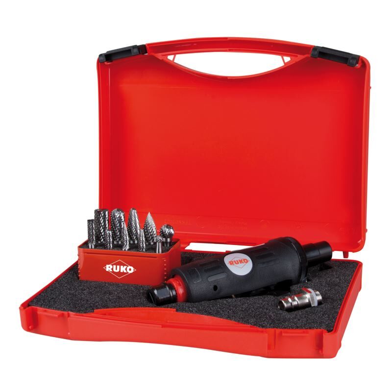 Set di smerigliatrice con aria compressa a 12 pezzi 1 smerigliatrice aria compressa + 10 pezzi. Cati in metallo duro set in mini-box ogni 1x Ø D1 6.0 + 12,0 mm 2 Pin frittura Forma A, cilindro (ZYA) con dentellatura 2 Falspits Form C, Roull Round (WRC) 2 Moldi frittura G, Arco a punta (SPG) 2 Falspelt Form F, Grow (RBF) 2 Form Fresedics D, Ball (KUD) + Pochetta frizione per smerigliatrice d'aria compressa