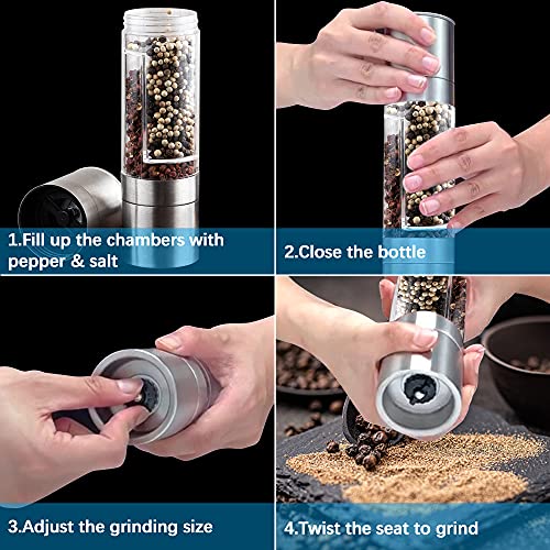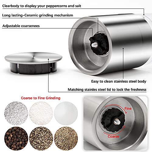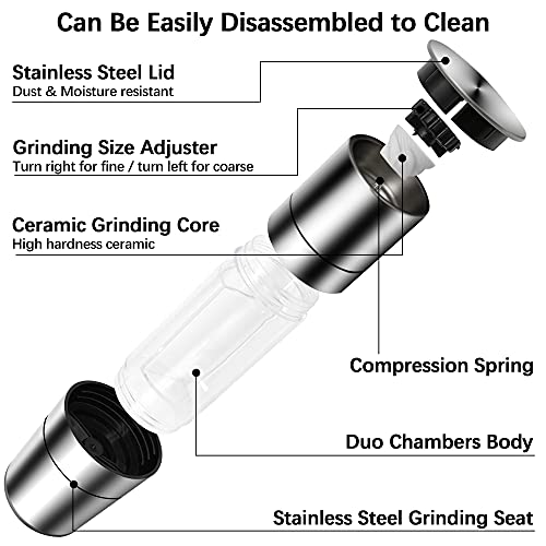 Materiale di alta qualità: la parte superiore del macinino per sale e pepe è realizzata in acciaio inossidabile di alta qualità e il corpo è realizzato in acrilico privo di BPA, durevole, antiruggine, antigoccia e sicuro da usare. Con il doppio meccanismo in ceramica è possibile scegliere diversi gradi di macinazione per sale e pepe. La parte inferiore raccoglie i residui di sale e pepe dopo ogni utilizzo.