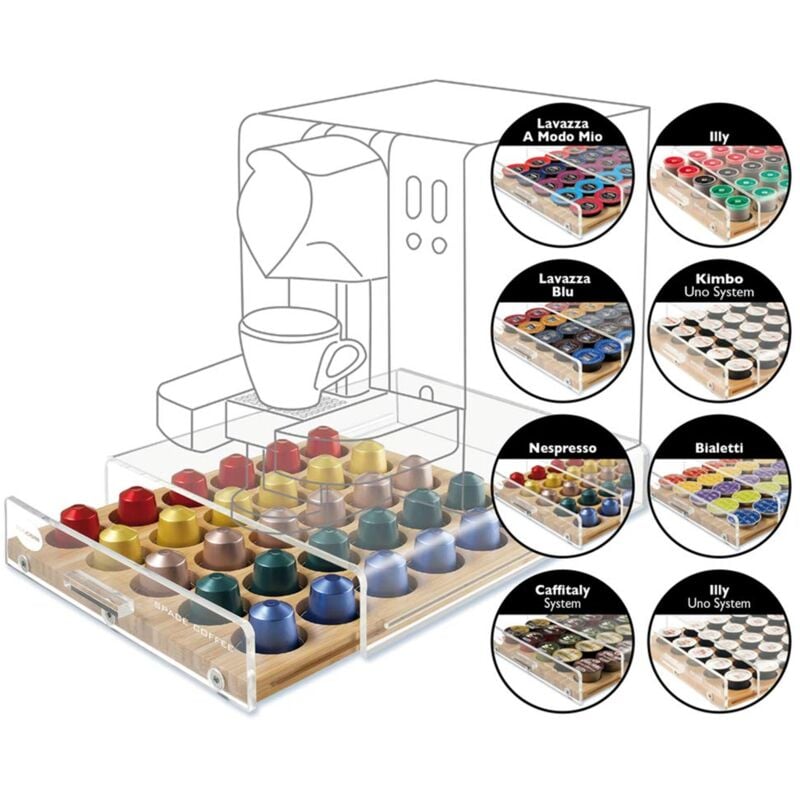 Space Coffee è il dispenser porta capsule universale, ideale per Nespresso, Lavazza A Modo Mio, Lavazza Blu, Bialetti e Caffitaly. Contiene fino a 30 capsule con un ingombro davvero minimo: grazie alla struttura con apertura a cassetto può infatti essere comodamente sistemato sotto la macchina del caffè.
