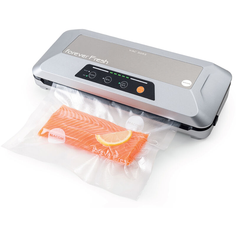 Macom VAC 3095. Colore del prodotto: Nero, Argento, Ampiezza massima di lavorazione: 30 cm, Certificazione: CE. Potenza: 110 W, Tensione di ingresso AC: 220 - 240 V, Frequenza di ingresso AC: 50/60 Hz. Larghezza: 402 mm, Profondità: 161 mm, Altezza: 83 mm Il portatagliarotolo e la taglierina per creare sacchetti nella misura desiderata, diminuiscono lo spreco di materiale. Selettore per confezionare alimenti umidi/secchi. Barra sigillante di dimensione doppia che assicura una chiusura ermetica. Luci LED indicano la progressione delle operazioni.