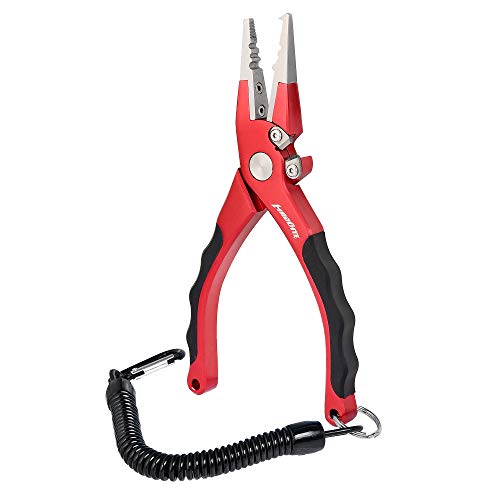 Comoda pinza Dimensioni dispongono di una guaina a spirale Cordino e cintura per un accesso rapido e facile accesso mentre Wading pesca, surf, pesca o banca. Pinza a becco lungo 19,1 cm e un 8,1 cm madbite Lunghezza è compatto, ma consente una presa migliore rispetto ad altri. Garanzia di anni.
