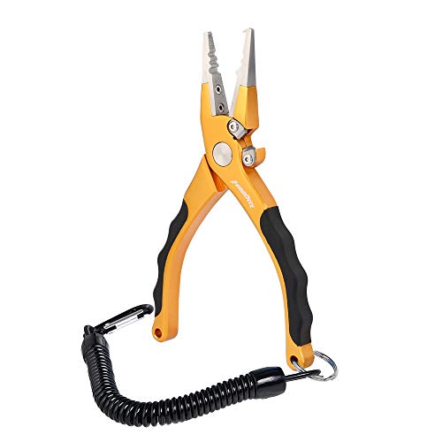 Comoda pinza Dimensioni dispongono di una guaina a spirale Cordino e cintura per un accesso rapido e facile accesso mentre Wading pesca, surf, pesca o banca. Pinza a becco lungo 19,1 cm e un 8,1 cm madbite Lunghezza è compatto, ma consente una presa migliore rispetto ad altri. Garanzia di anni.