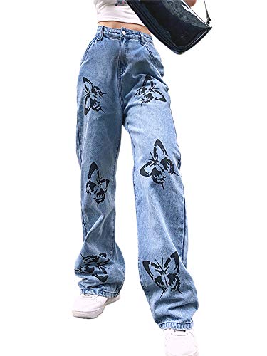 Madger Jeans a vita alta da donna Y2K Farfalla Stampa Dritta Gamba Larga Denim Pantaloni Larghi Larghi Casual Pantaloni Streetwear Blu L